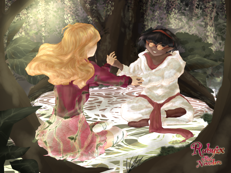 Not long after, that certain someone came hopping down the trees, dashing from one to another. She grabbed the lowest branch to swing and land right in front of the tall girl already on the ground. As she landed, the dirt beneath her magically moved up to catch her.
